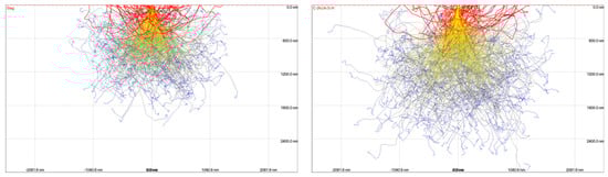 Monte Carlo simulation of the penetration of 1000 electrons accelerated at 15 kV in a beam radius of 10 nm into a GBFS (left) and the C-(N-)A-S-H gel (right). The red trajectories are back-scattered electrons, which result from elastic scattering events. Inelastic scattering events cause a reduction of electrons’ energy until the eventual disappearance in the specimen bulk. Yellow trajectories represent high-energy trajectories, and blue represents low-energy trajectories.