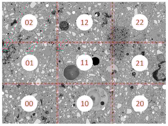 The microscope and EDX settings were kept constant for all the samples. For the microscope, the following settings were used: accelerating voltage 15 kV, beam current 3.4 nA, magnification 500× (equivalent to a field width of 256 microns), and a working distance (is the distance between the pole piece and the specimen surface) of 11.5 mm. The video images were collected with a resolution of 1024 × 768 (pixel size equal 0.25 μm). For EDX data collection, the resolution of each SI dataset was 512 × 384 (pixel size equal 0.5 μm) with a total acquisition time of 3600 s. An example of a stitched image of nine fields in SEM-backscattering electron (BSE) mode is presented in Figure 5. The 3 × 3 matrix (00-22) is selected so that the phase distributions over a larger sample area can be determined. Finally, SEM-EDX analysis provides data on the chemical composition across the large field of the sample by spectral imaging.