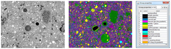 Figure 6 presents an example of the PARC phase map of a SI dataset of the microstructure (sample is paste S50, unsealed cured for 28 days). The phase model obtained for the first field (00 field, see Figure 5) can be applied to other fields, provided these were acquired under the same analytical conditions. If all the pixels in the new field are recognized with the first phase model, the next field can be processed. In case the second field contains pixels that are not recognized using the phase model, they will be assigned to new PARC phases, and the PARC model will be updated accordingly. This continues until all pixels in all 9 fields are satisfactorily assigned (see Figure 5). When the final phase model is defined, the PARC phase area proportions and the phase spectra results are exported. Spectra are processed using NSS microanalysis EDX software. Standardless EDX analysis was performed. The Phi-Rho-Z matrix correction procedure was used for raw data processing without normalizing the EDX results to 100%. The quantification in the Phi-Rho-Z mode is an element quantification method based on the matrix correction with the depth distribution function (Phi), mass density (Rho), and mean atomic number (Z). An example of a PARC legend of different phases (groups) is shown in Figure 6 (right) for the paste S50.