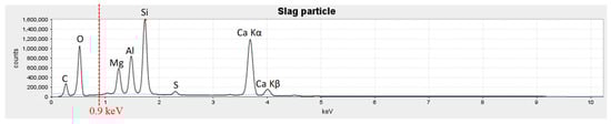 The phases were distinguished by using up to seven X-ray peaks (each peak corresponding to an element, exception was Ca, where Kα and Kβ can both be above threshold) exceeding the selected threshold value, as shown in Figure 8. Here, the user-defined threshold (minimum energy cutoff) was selected as 0.9 keV (so, C and O are not used for phase definition). The sum EDX spectrum of GBFS pixels is presented in Figure 8.