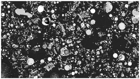 Large-area BSE image of a polished section of an epoxy-impregnated unreacted FA (the number of acquired fields was 12). The image width is 1024 µm.