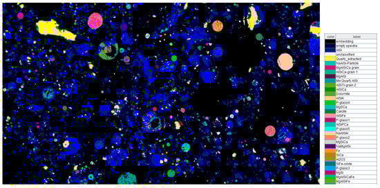 A possibility for overcoming the shortcomings of commercial SI-based phase recognition tools in the characterization of multiphase materials is the PhAse Recognition and Characterization (PARC) software developed by Van Hoek et al. [16], which is a postprocessing software for SI data. This software has been previously used for the characterization of cultural heritage objects [17], dust characterization [18], and the microstructure of metallurgical slag [16,19].