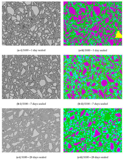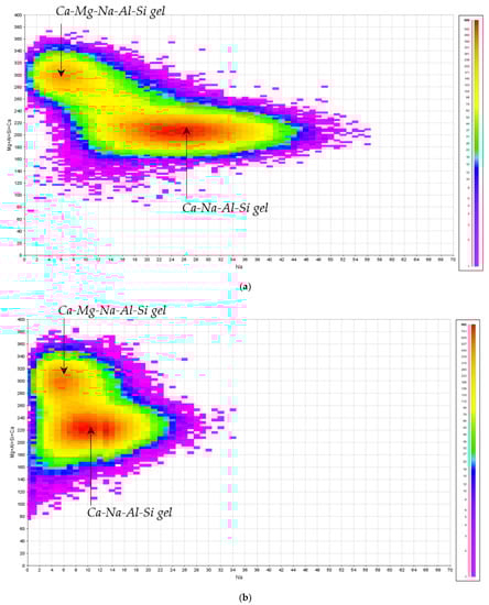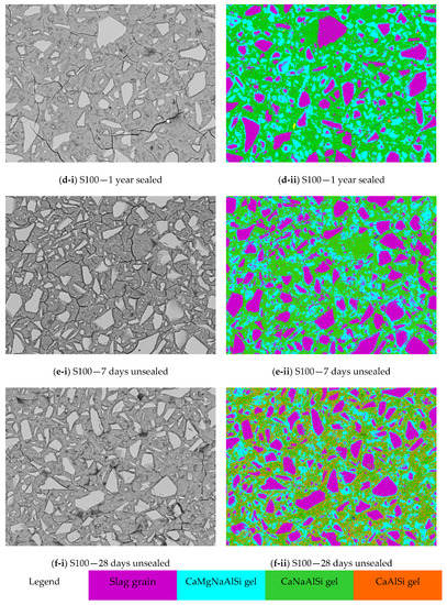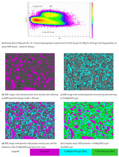 The compositional variation in Mg and Al + Si + Ca content is used for distinguishing the phases. As an example, Figure 13a shows regions identified for unreacted GBFS particles and the reaction products of Ca-Al-Si-Na gel and Ca-Mg-Al-Si-Na gel of the sealed 28 days cured S100 paste in a so-called PARC density plot. These regions are used for mapping the phases in the BSE images (Figure 13b–e). The arbitrary boundaries in the density plot of Figure 13a were set to determine the corresponding volume fractions of Mg-rich and Mg-poor gels. Although these boundaries are arbitrarily chosen, they allow the quantification of corresponding volumes of gels.
