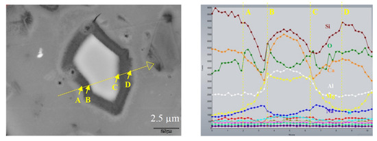 The composition of GBFS particles, which was obtained by averaging the field compositions with IGOR, is presented in Table 3. A comparison of the GBFS bulk composition obtained from XRF (see Table 1) and PARC (see Table 3) shows close correspondence or deviations that can be explained by Fe-metal droplets (yellow circled in Figure 9) and Al2O3 grains (white circled in Figure 9) included in the slag samples measured with XRF. These are naturally occurring contaminants in GBFS.