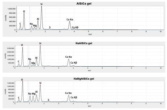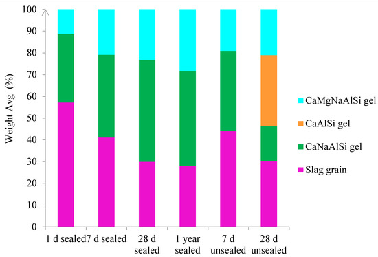 In Figure 21, it can be also seen that CaAlSi’s gel weight increases up to 28 d and then decreases in the sealed cured specimen. What is happening here is that the primary gel composition is changing over time due to the kinetics of the dissolution of the raw materials (FA, GBFS) in certain alkaline and curing conditions. It is assumed that due to the slow rate of FA dissolution, the formation of CaAlSi gel will first take place at an early age (up to 28 d) when Na+ is largely present in the pore solution. At later ages, Na+ will be bound in the main reaction product, changing the composition of the primary reaction product from CaAlSi gel to CaNaAlSi gel.