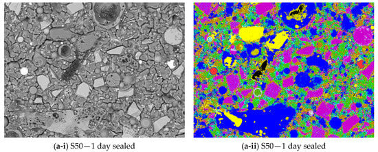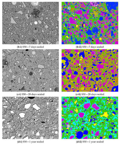 SEM-BSE images (a–f-i) of the microstructure of paste S50 at different curing periods, with mapped compound domains of different phases (a–f-ii). Image width = 250 µm.