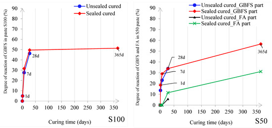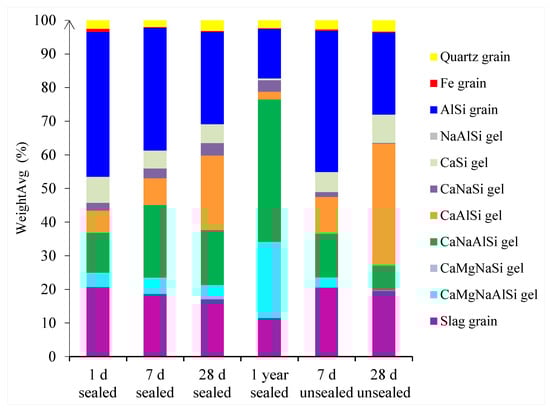 Also, the reaction degree of sealed and unsealed conditions is different (that is in contrast to observations made for GBFS in paste S100), probably due to different Na-binding capacities of FA and GBFS in paste S50 than of only the GBFS in paste S100. Furthermore, the low alkaline conditions and ambient curing temperature used in this study (when compared to literature [38,39]) are also possible reasons for a moderate degree of FA reaction in these samples pastes S50 at 7 days and 28 days. The degree of reaction of FA in unsealed conditions seems to be smaller than in sealed conditions. The degree of reaction of FA is mainly dependent on the reactivity of AlSi grain, NaAlSi grain, and CaAlSi grain. Quartz and Fe grain do not contribute to FA reactivity (Figure 21).