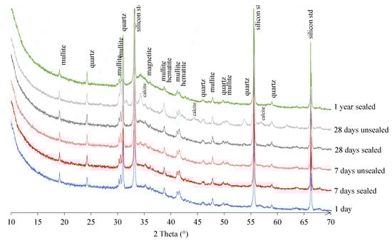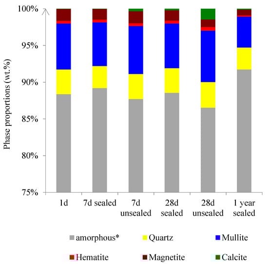 Figure 24 shows that curing conditions affect the mineralogical composition and the content of the phases in the samples S50. The amorphous phase content of the sealed cured pastes is similar at 1, 7, and 28 days, but it has increased after 1 year. While the amount of quartz is almost constant during 1 year of reaction (Figure 24), the mullite seems to be decreasing after 28 days. A decrease in the amorphous content can also be observed in unsealed cured samples that is due to the formation of calcite. The calcite content increases in the unsealed cured samples with the curing age. The calcite was formed due to superficial carbonation of the unsealed cured samples, as described in [35].