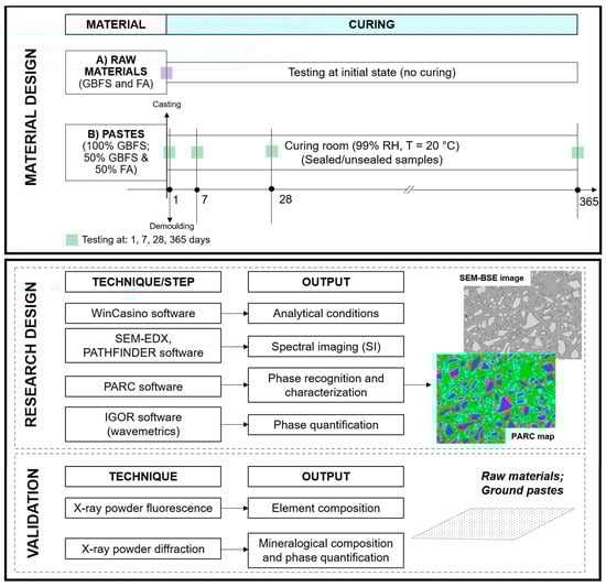 The mixing time for producing alkali-activated pastes was 5 min. The precursors (FA and GBFS) were dry-mixed for 3 min and then mixed with the activator. The mixing continued for the next 2 min until the moment when the mix was homogenized. The pastes were cast in cylindric polyethylene jars with a 35 mm diameter and a 70 mm height and vibrated for 15–30 s on a vibrating table. The samples were stored in the closed jars for 24 h after casting. For unsealed cured conditions, samples were removed from the jars and cured in a curing room at room temperature and relative humidity (RH) of ~99% for 28 days afterwards. The sealed samples were kept in the jars in the same curing room as the unsealed samples until the testing. The sealed samples were cured for up to 1 year. The samples were characterized with PARC, XRF, and XRD after certain periods with pre-drying (1, 7, 28 days, 1 year). For PARC, XRF, XRD, the representative samples, after a certain period of curing, were gently crushed (from the sample surface) into small pieces with dimensions of 1–2 cm3 and then immersed in isopropanol for one week, by which water is first replaced and then evaporated. Subsequently, the samples were placed under vacuum at 25 °C for at least three weeks prior to testing. After predrying, the samples, for SEM-EDX analysis, were impregnated using a low-viscosity epoxy resin and then polished down to ¼ μm. Before performing SEM-EDX, a carbon coating was applied to the polished sections of the samples.
