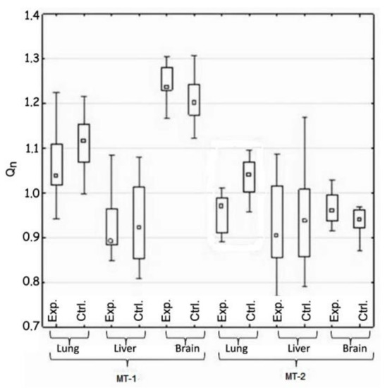The statistical analysis concerned the differences in the activity of genes for metallothionein-1 and 2 observed: (i) between the control and the experimental group of animals—hypothesis 1 (H1) (Table 2, Figure 1); (ii) in the same tissue—hypothesis 2 (H2) (Figure 2, Table 3); and between organs i.e., liver, lung, and brain—hypothesis 3 (H3) (Figure 3, Table 4). The null hypothesis (H0)—when p > 0.01—was the lack of significant differences between the analyzed samples. The test results are shown in Table 2, Table 3 and Table 4. A box-whisker plot of the ordered Qn values relative to the analyzed values is included.