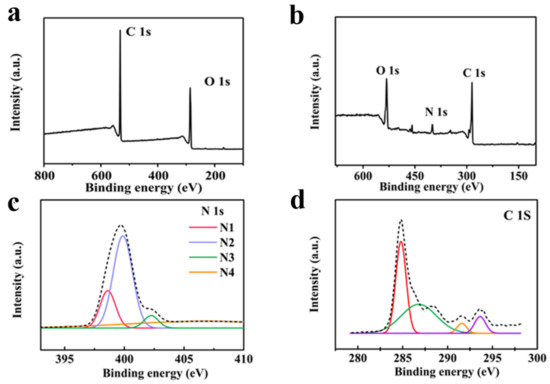 Characteristics of N-GNMs. (a) XPS spectrum of the N-GNMs; (b) XPS spectrum of the graphene oxide (GO); (c) High-resolution XPS spectrum showing the N 1s region of the N-GNMs; (d) High-resolution XPS spectrum showing the C 1s region of the N-GNMs.