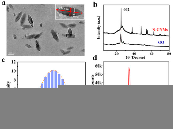 (a) TEM images of the N-GNMs; (b) XRD patterns of the N-GNMs and GO; (c) Particle size distribution and (d) Surface potential (ζ) analysis of the N-GNMs.