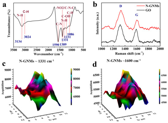 (a) Fourier transform infrared (FTIR) spectrum of the N-GNMs; (b) Raman spectra of the N-GNMs and GO; 3D spatial Raman mapping for N-GNMs (c) at ~1331 cm−1 and (d) at ~1600 cm−1. The field of view was 12 μm × 12 μm with a pixel-to-pixel distance of 2 μm.