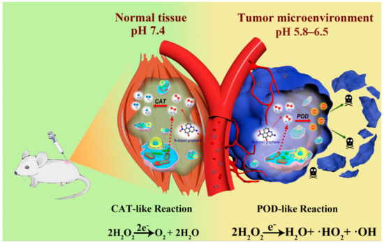 Tumor treatment faces essential challenges in tumor-specific and high efficiency treatment [1]. Nanozymes, the catalytic nanoparticles with enzyme-like properties that can catalyze enzyme reactions with comparable activity and robust stability, have recently attracted great interest in tumor treatment [2,3]. Tumor tissue forms a specific tumor microenvironment (TME) exhibiting hallmarks of mild acidity and an overexpression of hydrogen peroxide (H2O2) [4]. These peculiar features in the TME can thus be exploited as a strategy for tumor-specific treatment by introducing a peroxidase (POD)-mimicking nanozyme [5]. In the presence of a POD-mimicking nanozyme, H2O2 can be decomposed into hydroxyl radicals (•OH) under acidic conditions [6]. The produced •OH is a highly toxic substance that can attack and oxidize most organic molecules (cell proteins, cell proteins, etc.) at a rate constant of up to 106–109 M·s−1, thereby leading to apoptosis or the necrosis of tumor cells [7,8,9]. POD-mimicking nanozymes have been greatly developed. Nevertheless, POD-mimicking nanozymes adapted to a specific TME for highly efficient tumor-specific treatment are still required.