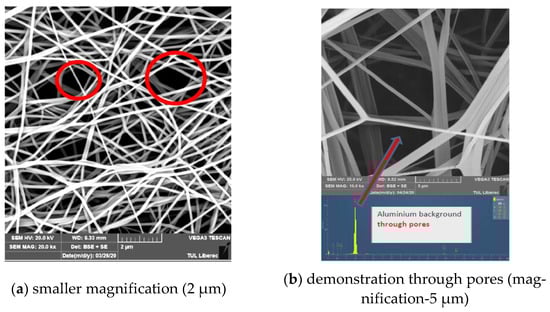 The term “nano” suggests that it is a material with pores in the nano range. In many cases, this term is used as a desirable attribute that is enjoyed by the general public. Experts understand according to the current European standard (nanotechnologies—terminology and definitions for nano-objects—nanoparticle, nanofibre, and nanoplate: ISO/TS 80004-2: 2015 E), nanomaterials are defined as materials that have at least one dimension (here diameter) in the range 1–100 nm. This range of diameters of the fiber segments in “nano” face masks or “nanolayers” prepared by electrospinning usually exceeds this limit (see Figure 3). These materials are then not “nano” according to the standard. The required pore size cannot be achieved using standard “nanofiber” layers, where there is a wide pore size distribution from nano to micrometers. By layering the individual “nanofiber” layers, it is possible to create a system with a much narrower pore size distribution [14], but the problem is how to combine these layers? A serious limitation is that the “nano-fibrous” layers are mechanically unstable and can, in a short time, cease to protect due to mechanical macro-breakage of the structure (formation of holes) and thus directly endanger the wearer. The problem is also caused by the fiber segments, which are released after only several cycles of abrasion (friction between the layers or mechanical action from the outside). It is, therefore, necessary to verify the durability of face masks containing “nano-fibrous” structures during use to test the released fragments ([14]) like the so-called microplastics.