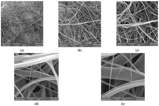 SEM images of prepared melt-blown layers at different magnifications: (a) 500 µm, (b) 100 µm, (c) 50 µm, (d) 10 µm, (e) 5 µm.