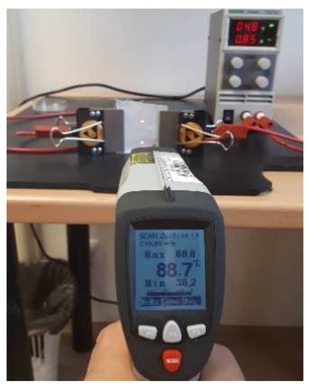 At 4.08 watts (4.8 volts and 0.850 amperes) the fabric sample with a dimension of 4 × 5 cm was heated to 88.7 °C and this temperature was maintained until switching off the power source. It is, therefore, possible to use textile fabric for filtration purposes and simultaneous realization of efficient generation of dry heat used for sterilization of face masks after use. Methods of effective sterilization must generally be in accordance with the materials used, regarding the formation of harmful products, in the event of possible degradation.