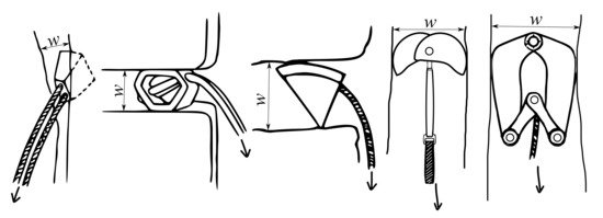 The PRGs can be installed permanently (pitons), or temporarily (nuts, hexentrics, tricams, and other devices, see Figure 1, where w represents the width of the rock crack and the arrow indicates the direction of the load in the case of a fall [1].