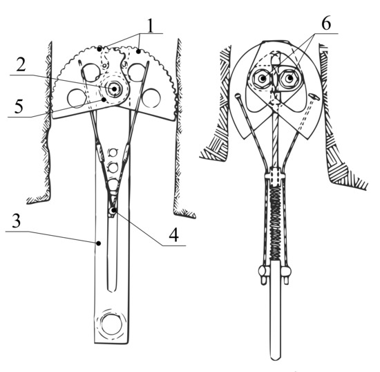 SLCD is a simple mechanism utilizing the conversion of the linear movement of the rope into the rotational movement of the cams for a firm attachment into the crack. SLCD in the single-axle variant was introduced in 1980 when it was patented by R. D. Jardine [8], see Figure 2. It consists of two pairs of opposing cams rotating separately (item 1), one pin situated between the opposing cams (item 2), a stem with a loop connected to the pins providing the attachment to the climbing rope (item 3), an operating element which, when pulled, folds the cams into the flattest possible position (item 4) and spring(s), which simultaneously expand the cams (item 5) upon release of the operating element.