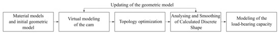 This chapter will be divided into five subchapters describing the individual stages of the process of obtaining the optimal cam shape in detail. Stage I describes the selection of the material models and the design of the initial geometry model. The next stage (Stage II) presents the virtual modeling of the cam using a linear computational model and its boundary conditions using FEM. Stage III focuses on the topology optimization of the linear computational model. Stage IV presents the analysis and smoothing of the calculated discrete shape. To achieve an even better solution of the geometry, Stages II–IV were performed again on the model arising after the first round of optimization and smoothing. Using this procedure, the ideal cam shape was obtained. In the last stage (Stage V), the load-bearing capacity was modeled using a nonlinear computational model. A diagram showing the research workflow of the process of obtaining the optimal cam shape is depicted in Figure 4.