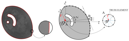 Finally, the idealization of the boundary conditions in the presented computational model was another important factor influencing the primary variable. One-dimensional truss elements were used to replace the pin to simplify the model and speed up the proposed procedure, see Figure 6. The stiffness matrix assembly of the truss elements can be found in the book by Bathe et al. [22], and the practical application of truss elements was presented in the article by Klemenc et al. [23]. High Young’s modulus value simulating an almost rigid pin was considered. The global stiffness matrix can be expressed as