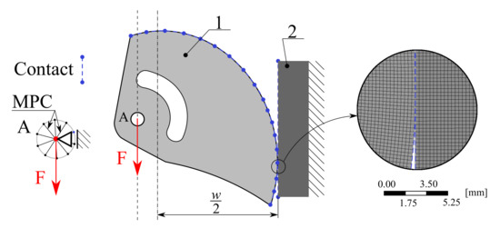 To find out if the smoothed discrete shape was optimal, it was necessary to analyze the load-bearing capacity of the cam. A full nonlinear computational model was created in AWB to capture the physical behavior during testing; this model also included nonlinear material behavior, large deflections, and contact behavior. In this case, however, the computational model was complemented by a planar geometrical model of the jaw, see Figure 7.