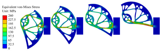 TOP comes with inherent (deep-rooted) problems such as the checkerboard pattern problem [29], and, hence, it is appropriate to use a filtering method. The filtering method causes the density of elements to depend on the neighboring elements [30]. However, this method causes the formation of areas with intermediate density, also known as grey areas, and it is, therefore, necessary to choose the density limit value above which the elements will be preserved (while, below it, they will be removed). In this case, a density filter was used. The density filter is averaging three variables from the element’s neighborhood (i.e., the derivation of the objective function, derivation of the constraint function, and density). The information was used to automate the above process in MATLAB. The script is capable of multi-load step 2D topology optimization after entering the input data. After performing the TOP, the resulting shape was analyzed and smoothed in Stage IV.