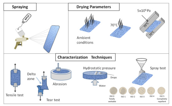 22]. Water, oil or strain resistance has been obtained through durable water repellent (DWR) species, i.e., polymeric per–and polyfluoroalkyl substances (PFASs) attached to a non-fluorinated polymeric backbone. Due to the environmental impact of long-chain PFASs (i.e., alkyl chain containing six or more carbons), also coupled with dangerous effects on human health, short-chain PFASs (i.e., waxes and silicones) have been proposed [