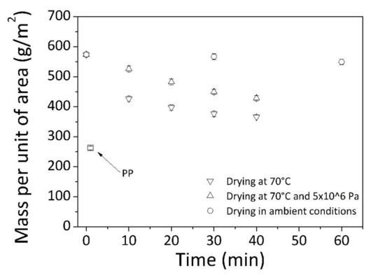 Figure 4 by showing the change of mass per unit of area as a function of time, in correspondence of specific drying setting: at ambient conditions, or at a temperature of 70 °C, also by applying a pressure of 5 × 10