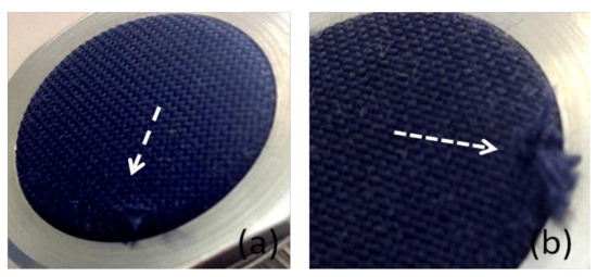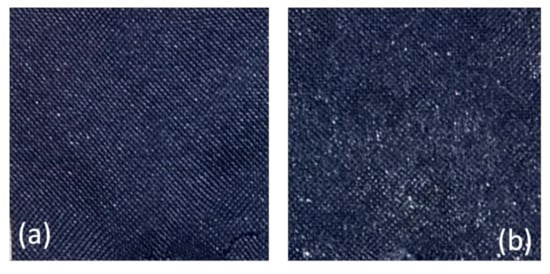 Figure 10b), the sample surface seemed to be fuzzier in the first case than in the second one. This was considered an effect of higher temperatures than ambient, applied during drying of impregnated fabric. In this condition, a strictly and fast removal of water took place for polymeric treatment.