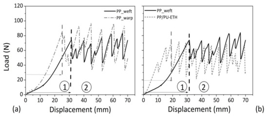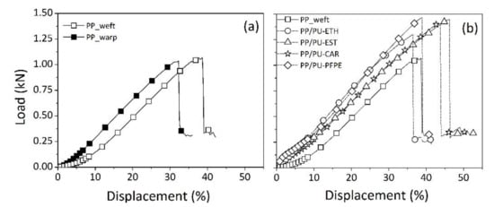 Figure 7a, it was noted that in correspondence of first breaking point, the starting PP textile was endowed with a higher extensibility, but achieved for lower load values, in the weft direction (solid line) respect to warp (dashed line). Then, by comparing PP/PU-ETH and PP samples, it appeared that the PU treatment reduced initial elongation and breaking load of neat material in delta point. In fact, for PP/PU-ETH sample, the peak was achieved in correspondence of lower deformations respect to PP.