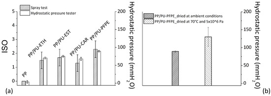 29], it does not prevent water absorption. The starting textile was completely wetted with surface exposed to the entrance of water. When the polyurethane was applied to PP-based fabrics, an increase of overall water resistance was verified in corresponding samples. In particular, the average ISO index became equal to 2.5 for PP/PU-PFPE system and about 1.5 for all other studied cases. Beyond gaining in surface wettability, the presence of polyurethane partially prevented the water transition throughout the weaving structure. In fact, by comparing neat and treated specimens, the hydrostatic pressure increased from values lower than 10 up to approximately 70 mmH