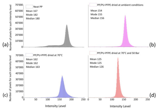 Figure 11d). So, drying at 70 °C led to less opaque and bright surface; whereas, pressure higher than ambient, in addition to a temperature of 70 °C, produced dark and less defined parts. In the latter case, the narrowest and most symmetrical distribution of pixels number associated with the highest ordinate value was measured.