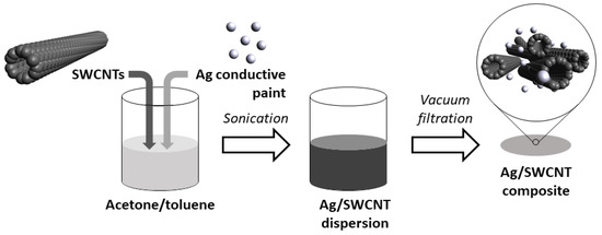 Neat SWCNT films were manufactured as a reference for this study as well. In that case, the process of film formation was conducted analogously, as highlighted above, but it was carried out in the absence of Ag conductive paint. To keep the processing volume consistent, SWCNTs were added to 80 mL of a mixture of acetone and toluene (1:1 by weight).