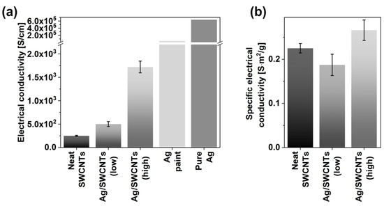 (a) Electrical conductivity of the SWCNT films before and after doping with a low and high amount of Ag conductive paint. The conductivity of Ag conducitve paint and pure Ag are taken from the literature and given as a reference [37,51]. (b) Specific electrical conductivity of the SWCNT films before and after doping with a low and high amount of Ag conductive paint.