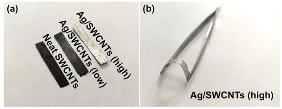 Visual inspection of the composites also shows that despite the Ag addition, the SWCNT networks preserve their mechanical integrity (Figure 5). Furthermore, with the increase in Ag content, the material becomes grey and eventually silvery as expected. It is also evident that even at the high content of Ag, the material remains highly flexible, as illustrated in Figure 5b.