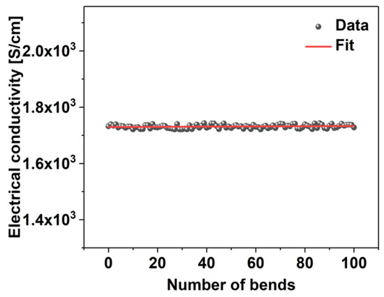 Lastly, to ensure the durability of the proposed materials, we inspected the impact of repeated bending of the composite on its electrical conductivity (Figure 6).