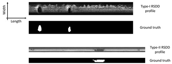 The publicly available data resource namely the rail surface discrete defects (RSDD) dataset [36], which has been extensively applied in evaluating different approaches for railhead defect detection (e.g., [17,37,38]), constituted the data foundation of this research. It comprises two types of track surface images: the Type-I RSDD dataset contained 67 challenging images acquired from express tracks, and the Type-II RSDD dataset contained 128 challenging images acquired from ordinary/heavy haul tracks. Each surface profile contained one or more defects that were difficult to identify owing to the noisy backgrounds. These defects included squats at different levels and other related damages produced by rolling contact fatigue. Other important defects, like rail corrugation and railhead wear, were not concerned in the RSDD dataset. Crossings and turnouts were also excluded. Experienced experts have exported the actual defect locations into the corresponding “ground truth” images [36], which can work as accurate outputs to supervise our machine learning networks. The ground truth images contain pixel values of 0 at damage locations and 255 at other locations, different from the actual railhead pictures. Therefore, the labeled defect information only contains the surface sizes (lengths along the track direction and widths) except the depths and other parameters. As shown in Figure 1, the length and width coordinates are both on the top surface of the railhead, and we were concerned with the 2-dimensional analysis on the railhead top surface. The length coordinate represents the distance (in pixel levels) along the running direction of railways, and the width coordinate represents the distance perpendicular to the length. These coordinates are used in the rest of this paper. To regularize the learning inputs, images in the individual dataset should be resized to the same pixels. The images in the Type-II RSDD dataset already had the same pixels of , while those in the Type-I RSDD dataset were resized to the pixels of . The resolution (1 × 1 pixel) of Type-II images was 1 mm × 1 mm [15], and thereby, the real size was 1250 mm × 55 mm. The resolution and real size of Type-I images were not available in the literature. Two representative railhead profiles and corresponding ground truth images are presented in Figure 1.