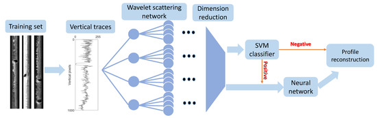A specific machine learning framework (Figure 4) was designed in this paper to identify the locations and sizes of railhead defects, different from the general learning architectures in the literature that overlooked the size information. Firstly, the 2D input training dataset was decomposed into 1D vertical traces (along the running direction), which can preserve horizontal labels (the trace location along the rail width) and extend the input dataset sufficiently for convincing learning. These vertical traces are then fed into the predefined WSNs to extract signal characteristics. The SVM classifier follows closely, identifying the existence of railhead defects on the vertical traces. Therefore, the vertical traces are divided into two categories, “positive” (existing defects) and “negative” (non-existing defects). As the negative traces contain no defect features while occupying a considerable amount, they will affect the learning model adversely, e.g., overlooking tiny defects. Under this consideration, the SVM classifier is significant in conveying positive traces to the NNs for further location and size identification. NNs were adopted to restore the ground truth traces from the positive traces, and the ground truth of negative traces equaled 0. Finally, the processed profiles containing location and size information were reconstructed by orderly merging of the output traces.