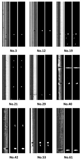 The last procedure concerned reconstructing the inspection profiles and identifying the defects. Table 3 presents the learning accuracy by comparing the reconstructed profiles with the ground truth images. The validation accuracy remarkably reached 99.80%, indicating the effectiveness of our learning procedures. Although the WSN+SVM procedure had a 2.8% classification error, each misclassified trace affected less than 10 pixels, and thereby the effect on the whole framework was less than . Although the SVM+NN procedure had a 0.53% error, the positive traces only accounted for around 30% of all traces, and thereby, the effect on the whole framework was around . Therefore, the ultimate learning accuracy was higher than that of the partial procedures.