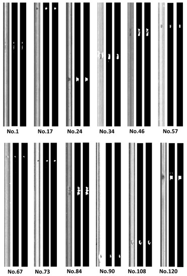 Figure 6 shows the learning results of 12 example rails (the labels are provided in the dataset) in the validation set. The original images had different brightness, contrast, and defect sizes. Despite these factors, the reconstructed profiles corresponded well with the ground truth images, as the defect locations and shapes were visibly similar. For example, the identified locations of defects on the No. 1 rail were (21, 406) and (20.5, 458), while the actual locations were (21, 406) and (20.5, 454), with errors less than four pixels. The defect sizes were convenient to determine by summing the white pixels. The maximum error occurred in the No. 57 rail, as the identified defect size was 293 pixels and the error was 9.6%. The minimum error occurred in the No. 46 rail, as the identified defect size was 972 pixels and the error was 0.1%. Therefore, the developed approach performed promisingly in identifying the sizes and locations of the railhead defects.