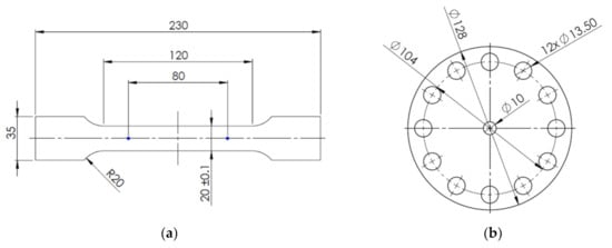 Specimens for mechanical testing were manufactured from the heat-treated samples. Tensile testing specimens were produced by milling the specimens’ contour. HET specimens were prepared by punching a 10 mm hole in the center of the disk (Figure 2).