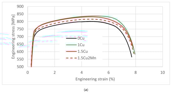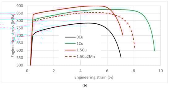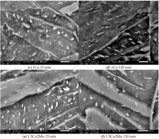 The stress-strain curves (Figure 3) were analyzed to obtain values of the engineering stress drop (decreased UTS) from maximal value to the final force and toughness in a quasistatic tension (Table 3). The toughness was determined as the area under the stress-strain curve (AuC), thus, expressed in MPa. The AuC followed the trend of Cu-related strengthening. Higher YS and UTS generally led to higher AuC because of comparable ductility of all materials and the same general shape of the stress-strain curves. The decrease in the UTS values did not follow any trend for the 15-min bainitization treatment. There was a difference in the case of the 12-min bainitization treatment, where 1.5Cu and 1.5Cu2Mn steels exhibited lower values of UTS than the 0Cu and 1Cu steels.