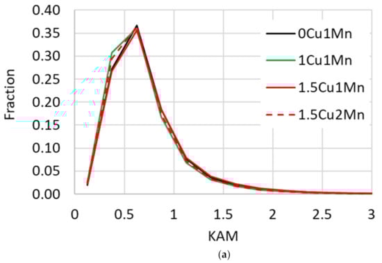 The EBSD analysis included computation of the kernel average misorientation (KAM) which was computed for each point on the EBSD map. Its value is an average misorientation between a given point and each of its neighbors. It gives an estimate of the lattice curvature, and therefore also an estimate of the dislocation density at a given point [23]. Figure 7a shows the distribution of the KAM values for all points on the EBSD maps. The distributions from all experimental steels were identical.