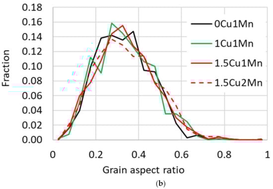 The lattice slip stress can be assumed to be equal for all experimental steels (being a constant of the ferrite lattice). Grain boundary strengthening depends on the grain size and in the case of non-equiaxial grains also on grain shape. These parameters were both determined from the EBSD maps. Grains were defined as areas surrounded by boundaries with a misorientation of 2°. This lower limit was usually considered to be a low-angle boundary misorientation limit (high-angle one being usually set on 15°). Therefore, the grain analysis took both high- and low-angle boundaries into account and effectively displayed values for the subgrain structure. This approach was chosen due to the nature of the bainitic structure composed of elongated ferrite crystals separated often only by low-angle boundaries. Table 4 shows the average grain size and Figure 7b shows the distribution of grain aspect ratio. These parameters can both be considered to be identical for all experimental steels.