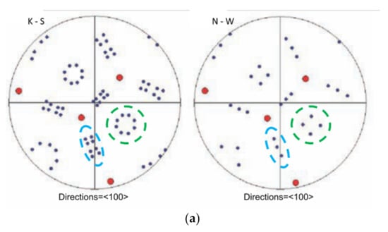 Pole figures (PFs) of ferrite crystals from one prior austenite grain. (a) Modeled PF according to K-S and N-W orientation relationships (red dots represents directions of the original austenite lattice, blue and green lines encircle characteristic features in the PF) source [24]; (b) PF from one prior austenite grain in the 0Cu 15-min treated sample; (c) PF from one prior austenite grain in the 1.5Cu 15-min treated sample. Reproduced with permission from ref. [24]. Copyright 2011 The Chinese Society for Metals. Published by Elsevier Ltd.