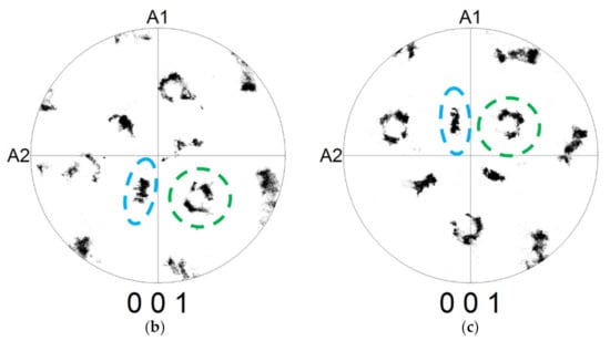 Pole figures (PFs) for single prior austenite grains were obtained to determine the orientation relationship between austenite and ferrite during bainitic transformation. Figure 8a shows the modeled PF for the Kurdjumow–Sachs (K-S) and Nishiyama–Wassermann (N-W) orientation relationships [24]. The modeled PFs both look similar with individual orientation variants (points) arranged in two types of repeating groups, i.e., an elongated set of eight (K-S) or three (N-W) variants and a group of eight (K-S) resp. 4 (N-W) of octagonal resp. square arrangement. These groups are highlighted in the modeled PF. Corresponding groups of variants are also highlighted in the measured PF in Figure 8b,c. It seems that the shapes of these groups match with the PF of the K-S orientation relationship. The same appearance was observed for the PF of all experimental steels.