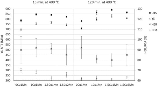 Figure 9 compares the YS, UTS, ROA, and HER values of the experimental steels after 15 and 120 min of holding treatments at 400 °C. The 15-min treatment caused roughly a 50 MPa increase in the YS and UTS values of the Cu-alloyed steels as compared with the 0Cu steel. This strengthening was not dependent on the Cu and Mn content as solid-solution strengthening should be. This fact might be caused by slight carbide precipitation differences among experimental steels which were not apparent from the SEM micrographs.
