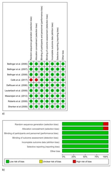 - Higgins, J.P.T.; Altman, D.G.; Gøtzsche, P.C.; Jüni, P.; Moher, D.; Oxman, A.D.; Savović, J.; Schulz, K.F.; Weeks, L.; Sterne, J.A.C. The Cochrane Collaboration’s tools for assessing risk of bias in randomised trials. BMJ 2011, 343, d5928. [Google Scholar] [CrossRef]