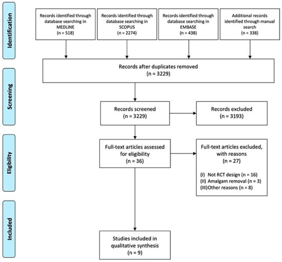 An electronic bibliographic search was carried out on three databases (MEDLINE, EMBASE, and Scopus) and was carried out by two authors (M.P. and A.L.) who independently selected each other all the articles relating to dental amalgam.